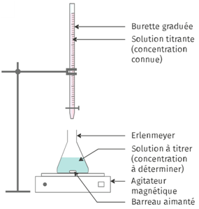 On l’introduit dans un erlenmeyer avec un barreau aimanté placé sous un agitateur magnétique. Nous y versons à l’aide d’une burette graduée, une solution de permanganate de potassium de concentration C2 connue.